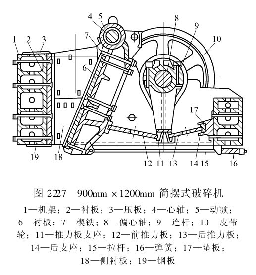 1.機架 機架是上下開口的四壁剛性框架,用作支撐偏心軸并承受破碎物料的反作用力,要求有足夠的強度和剛度,一般用鑄鋼整體鑄造,小型機也可用優(yōu)質鑄鐵代替鑄鋼。大型機的機架需分段鑄成,再用螺栓牢固鏈接成整體,鑄造工藝復雜。自制小型顎式破碎機的機架也可用厚鋼板焊接而成,但剛度較差。 2.顎板和側護板 定顎和動顎都由顎床和顎板組成,顎板是工作部分,用螺栓和楔鐵固定在顎床上。定顎的顎床就是機架前壁,動顎顎床懸掛在周上,要有足夠的強度和剛度,以承受破碎反力,因而大多是鑄鋼或鑄鐵件。 3.傳動件 偏心軸是破碎機的主軸,受有巨大的彎扭力,采用高碳鋼制造。偏心部分須精加工、熱處理、軸承襯瓦用巴氏合金澆注。偏心軸一端裝帶輪,另一端裝飛輪。 4.調節(jié)裝置 調節(jié)裝置有楔塊式,墊板式和液壓式等,一般采用楔塊式,由前后兩塊楔塊組成,前楔塊可前后移動,頂住后推板;后楔塊為調節(jié)楔,可上下移動,兩楔塊的斜面倒向貼合,由螺桿使后楔塊上下移動而調節(jié)出料口大小。小型顎式破碎機的出料口調節(jié)是利用增減后推力板支座與機架之間的墊片多少來實現(xiàn)。 5.飛輪 顎式破碎機的飛輪用以存儲動顎空行程時的能量,再用于工業(yè)形成,使機械的工作符合趨于均勻。帶輪也起著飛輪的作用。飛輪常以鑄鐵或鑄鋼制造,小型機的飛輪常制成整體式。飛輪制造,安裝時要注意靜平衡。 6.潤滑裝置 偏心軸軸承通常采用集中循環(huán)潤滑。心軸和推力板的支撐面一般采用潤滑脂通過手動油槍給油。動顎的擺角很小,使心軸與軸瓦之間潤滑困難,常在軸瓦底部開若干軸向油溝,中間開一環(huán)向油槽使之連通,再用油泵強制注入干黃油進行潤滑。